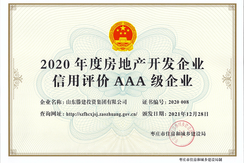 近期,枣庄市住房和城乡建设局发布了2020年度全市房地产开发企业信用等级评定结果。拼搏在线官方网站有限公司凭借在企业客观信用能力、经营信用情况、社会信用等方面出色的综合实力,荣获2020年AAA级房地产开发企业最高信用等级。房地产开发企业信用评定是枣庄市住房和城乡建设局依据《枣庄市房地产开发企业信用评价实施细则